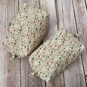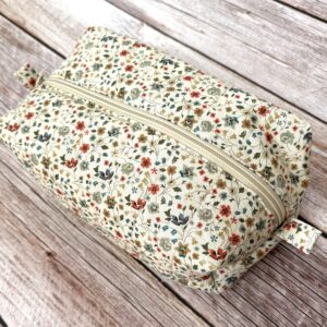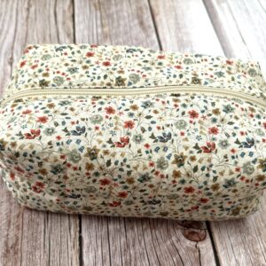Beež lilleline kosmeetikakott. Kott on valmistatud puuvillasest kangast, sees ühevärviline vooder. Koti mõõdud ca 19x9cm, kõrgus 9cm.