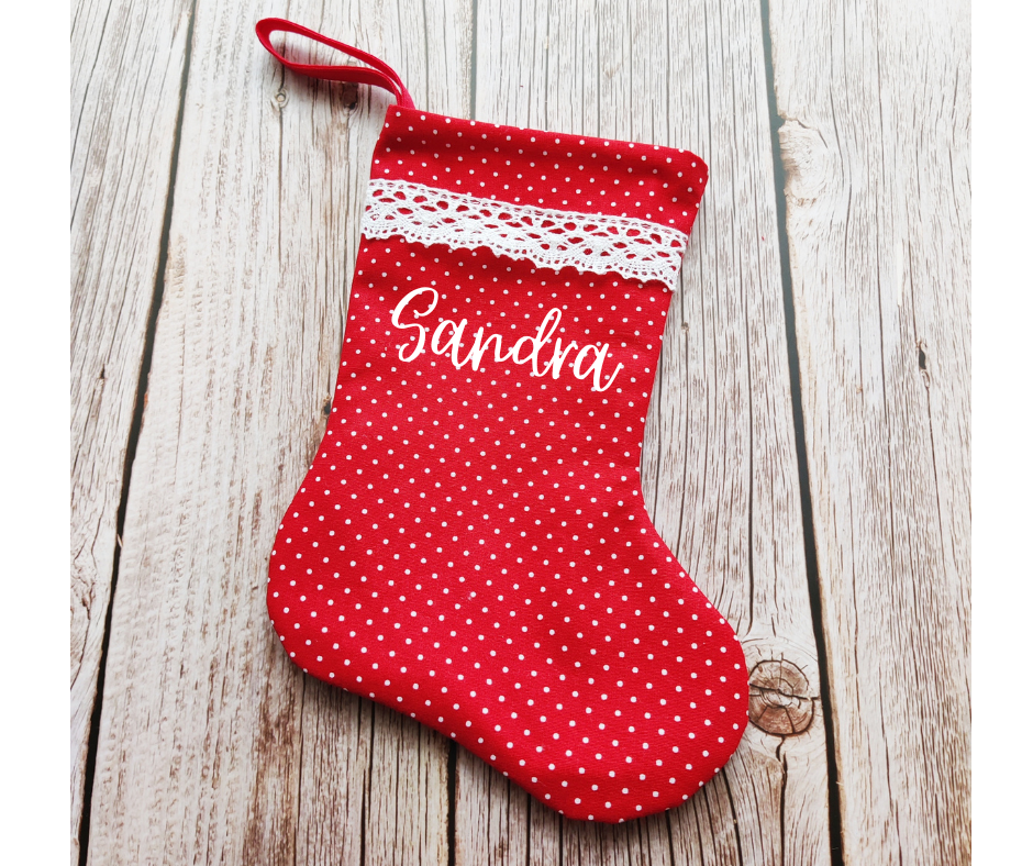 Punane pitsiga jõulusokk on kenaks jõulukaunistuseks ja sinna sisse on päkapikkudel hea kingitusi tuua. Päkapikusokk on valmistatud täpilisest puuvillasest kangast, sees on ühevärviline vooder.