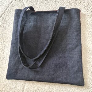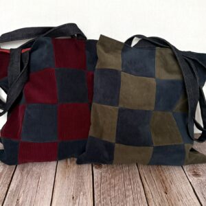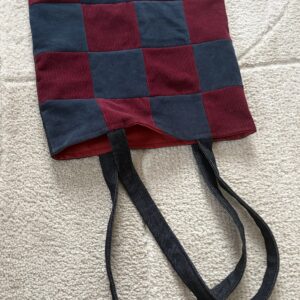 Velvet ja teksakangast õmmeldud õlakott. Esipool sinise ja punaseruuduline, tagumine pool tume teksa, sees kirju vooder. Koti mõõdud 33x34cm, kotil on pikad sangad. Kombineeritud on uusi ja taaskasutatud kangaid.