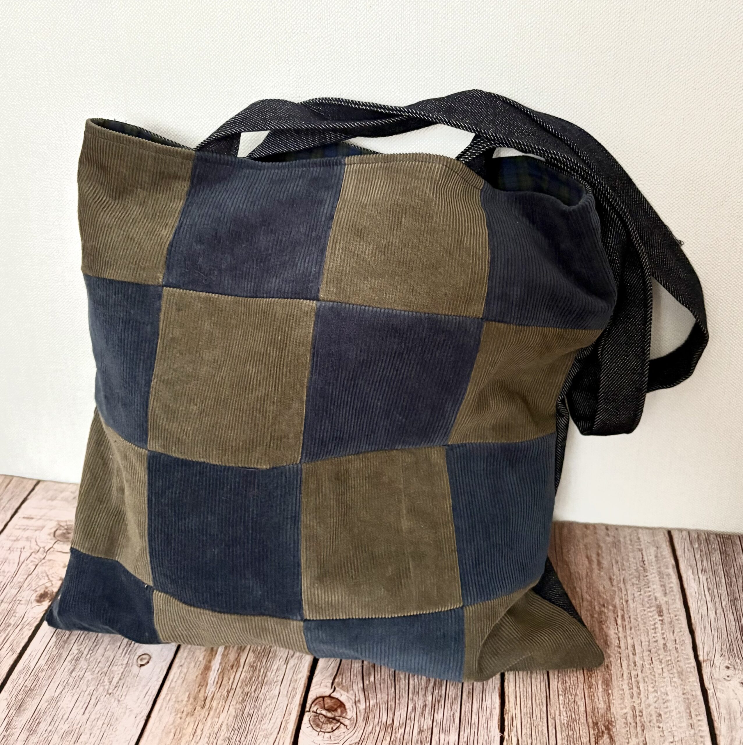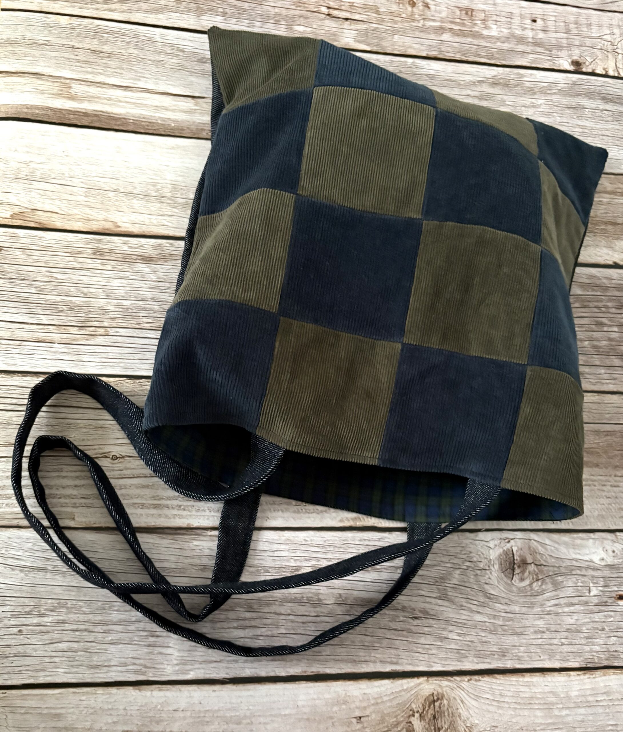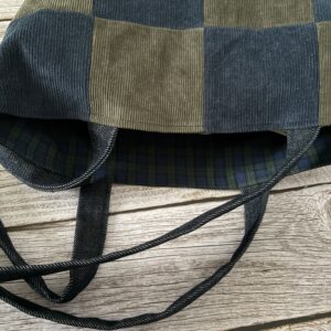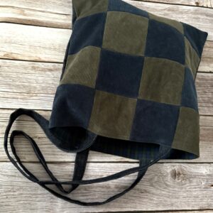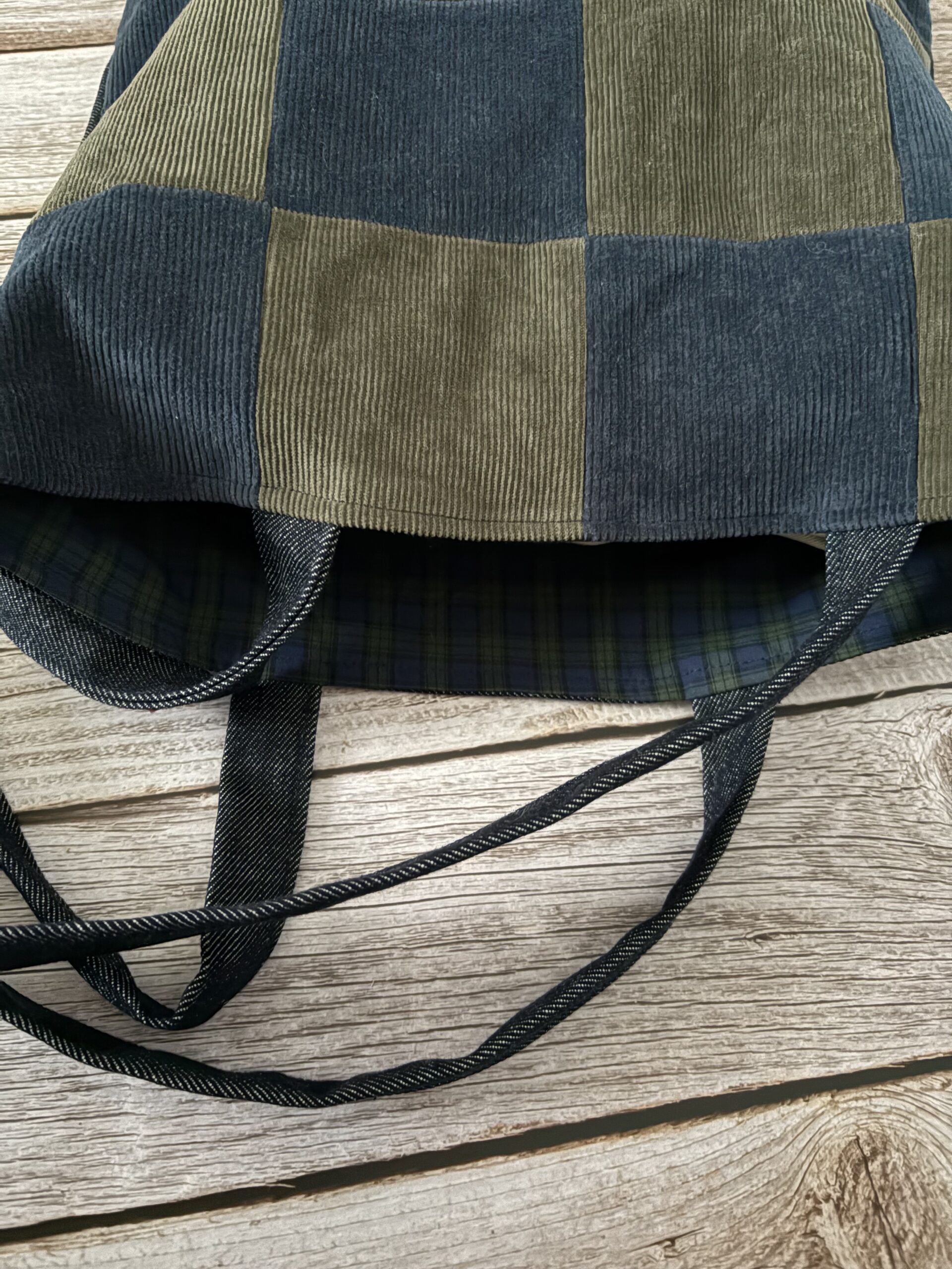 Velvet ja teksakangast õmmeldud õlakott. Esipool sinise ja roheliseruuduline, tagumine pool tume teksa, sees kirju vooder. Koti mõõdud 33x34cm, kotil on pikad sangad. Kombineeritud on uusi ja taaskasutatud kangaid.