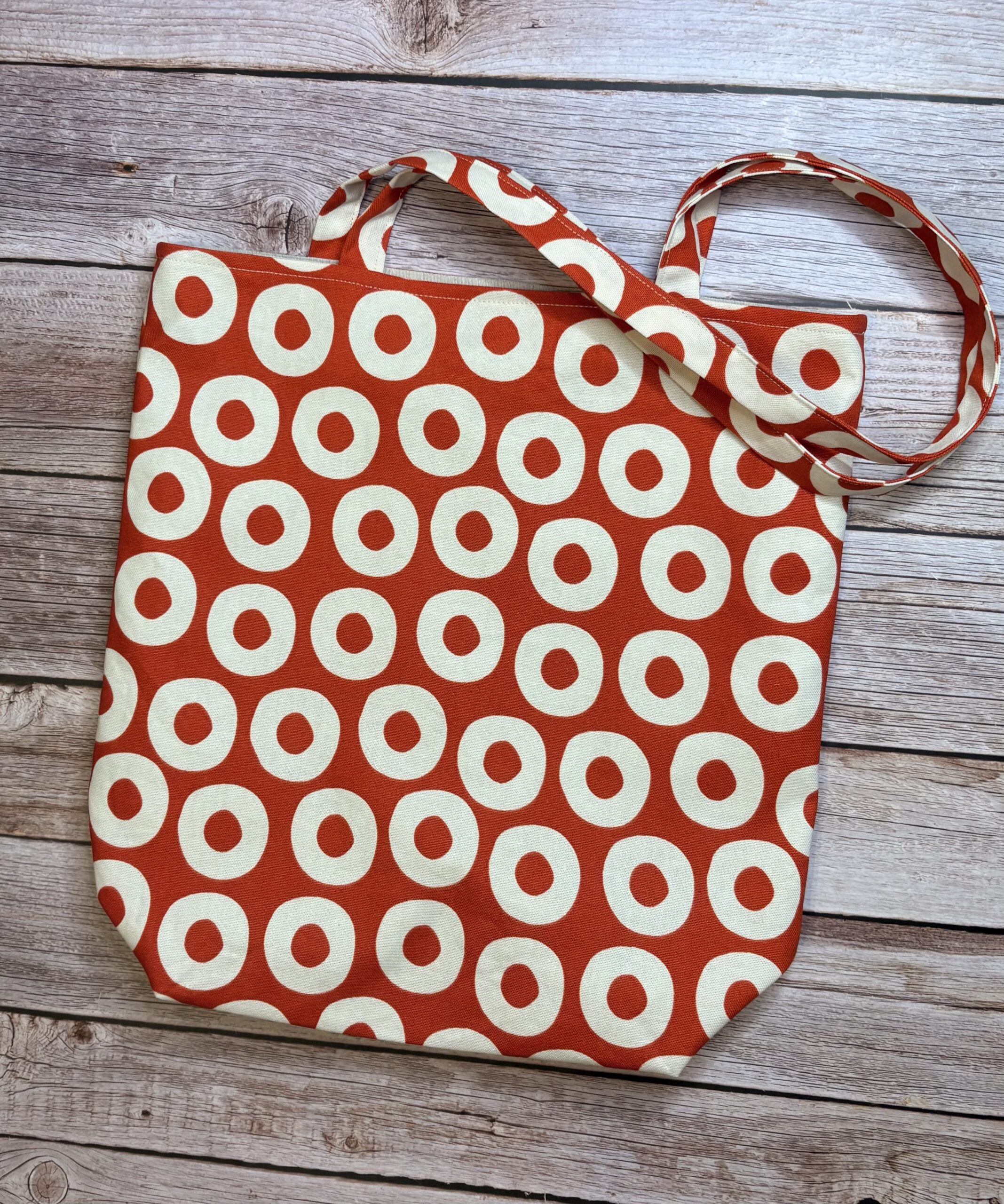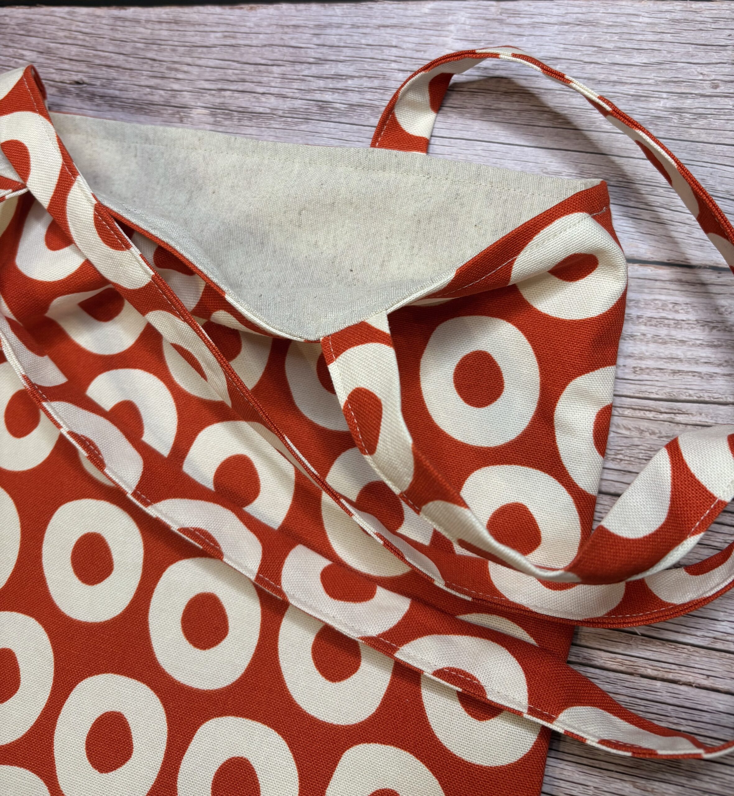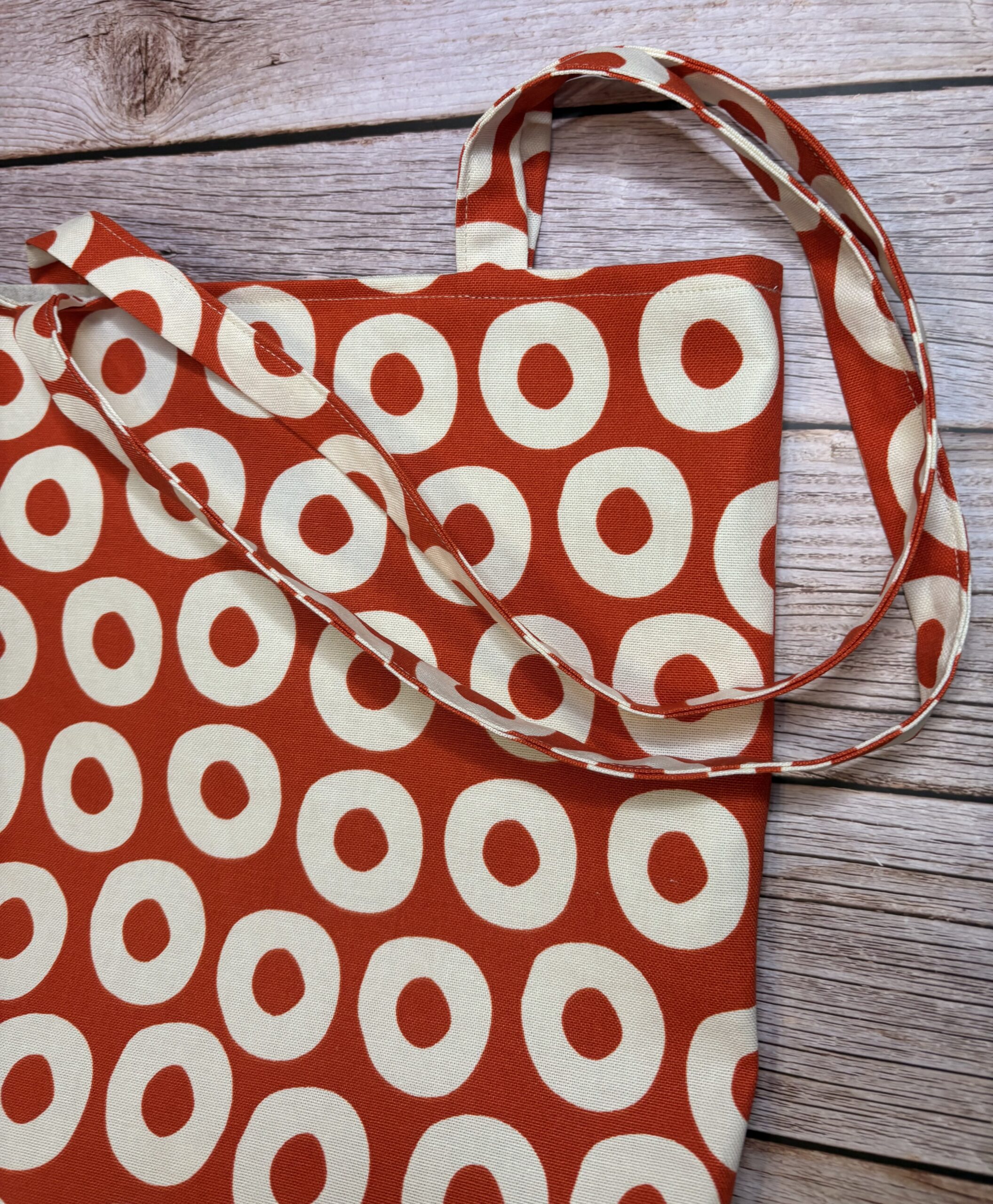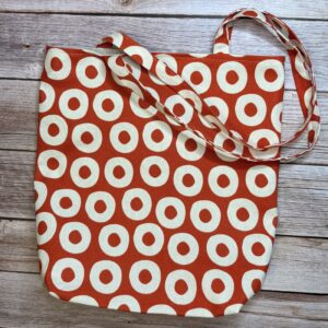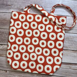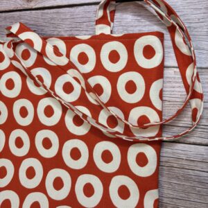 Värviline riidest kott , mis on valmistatud kirjust puuvillasest kangast ning sees on ühevärviline vooder.