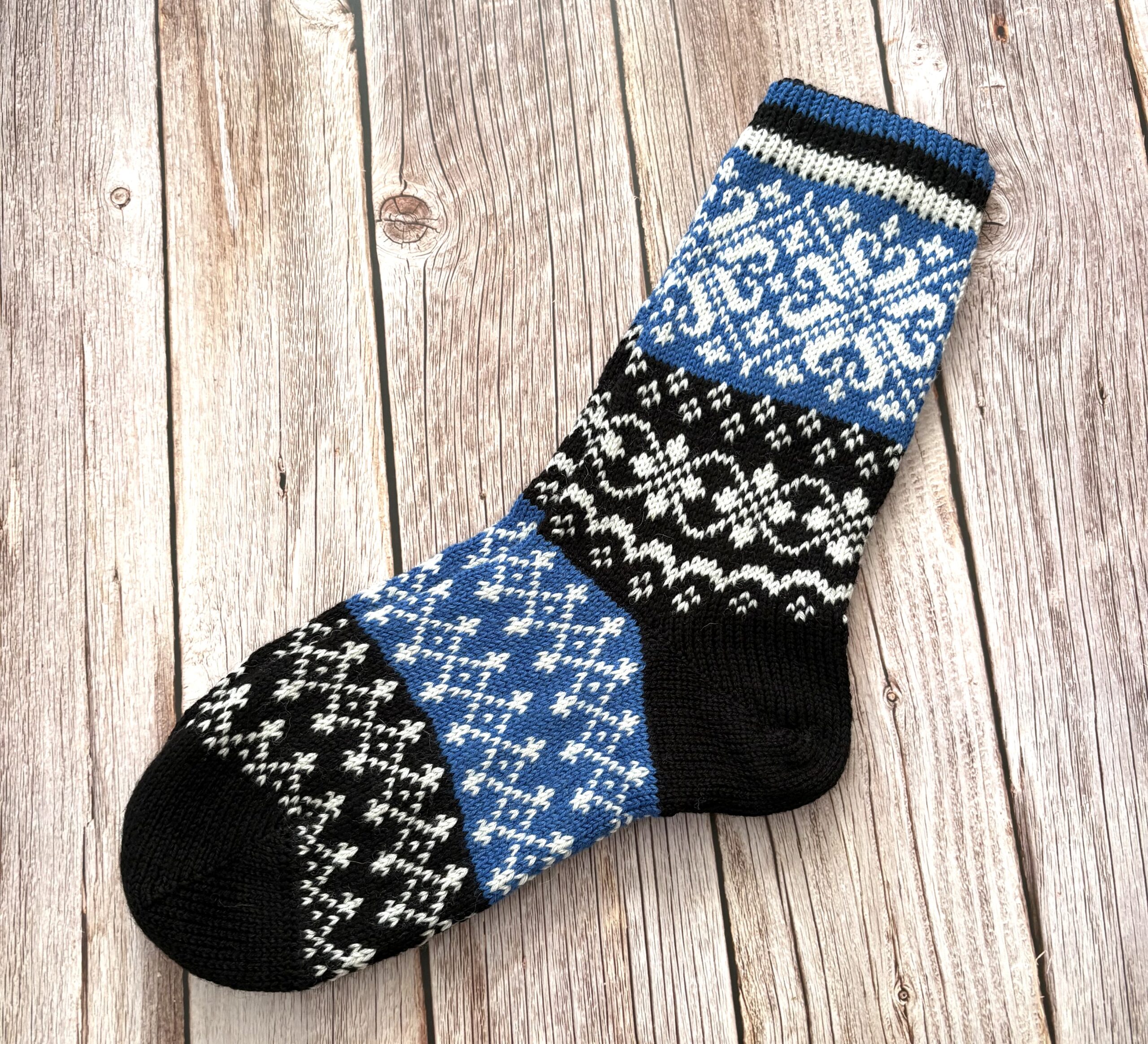 Villased sokid meestele on must-valge mustriga. Sokid on kootud käsikudumismasinaga, lõnga koostis 60% meriino, 40% akrüül. Tänu meriinosisaldusele on sokid pehmed ja sobivad hästi ka palja jala peal kandmiseks.