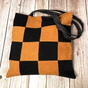 Velvet ja teksakangast õmmeldud õlakott. Esipool kollastest ja mustadest velvetkangast ruutudest ja tagumine pool tume teksa, sees kirju vooder. Koti mõõdud 33x34cm, kotil on pikad sangad. Kombineeritud on uusi ja taaskasutatud kangaid.