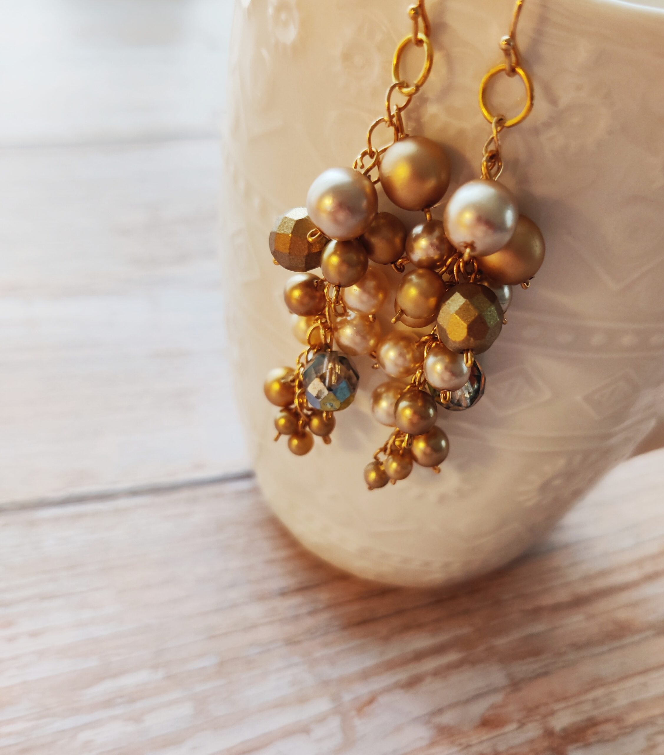 Kõrvarõngad koosnevad erineva suurusega beežides toonides pärlikattega helmestest ning lihvitud helmestest.
