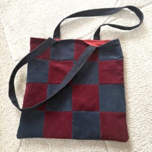 Velvet ja teksakangast õmmeldud õlakott. Esipool sinise ja punaseruuduline, tagumine pool tume teksa, sees kirju vooder. Koti mõõdud 33x34cm, kotil on pikad sangad. Kombineeritud on uusi ja taaskasutatud kangaid.