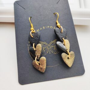 Südametega kõrvarõngad musta ja kuldse tooniga on põneva struktuuriga. Rippuvad kõrvarõngad koosnevad kolmest ühendatud südamest.