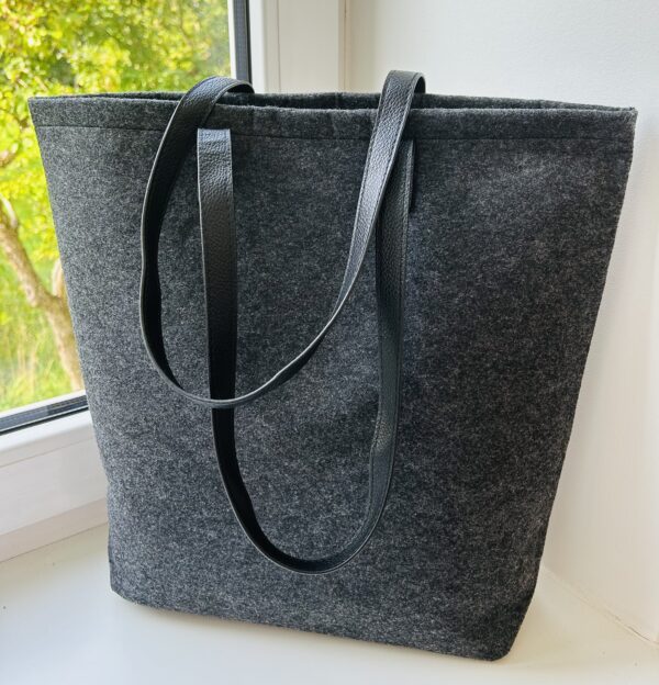 Mahukas õlakott on valmistatud kvaliteetsest tugevast tumehallist viltkangast ning sellel on musta värvi kunstnahast sangad.
