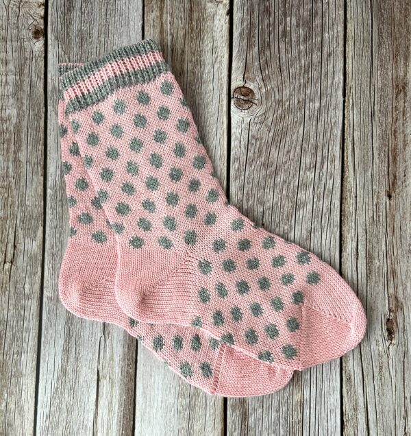 Villased sokid on roosat värvi ning kelmikate hallide täppidega. Sokilõnga koostis 60% meriino, 40% akrüül. Tänu meriinosisaldusele on sokid pehmed ja sobivad hästi ka palja jala peal kandmiseks.