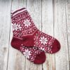 Villased sokid on tumepunasest lõngast valge rahvusliku mustriga, see värvikombinatsioon on ideaalne ka jõulupakki panemiseks.